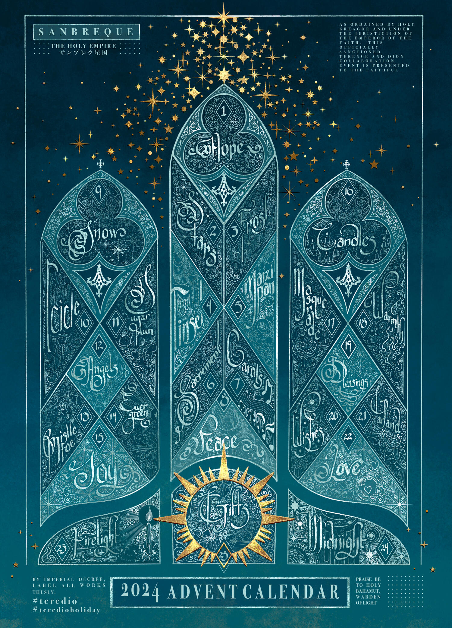 RulesStarting December 1st. A collection of 25 holiday themed prompts will be posted in advance to give all participants ample time to create fanworks. You may participate as often or as a little as you like. Please share your fanworks with the tag #teredioholiday on the day that corresponds with the prompt.* (E.g. Hope will be posted on December 1st, Peace on December 8th, and so on.) Each fanwork should focus on Terence, Dion, or both with implied current or future TereDio.All fanworks including fic, art, cosplay, poetry, songs, FFXIV manipulations are permitted, with the exception of AI generated works. All ratings are acceptable. Please tag accordingly.*As the winter holidays are busy, if you cannot post on the corresponding day, please post on the nearest day possible. The event will draw to a close January 1st.Prompts1. Hope